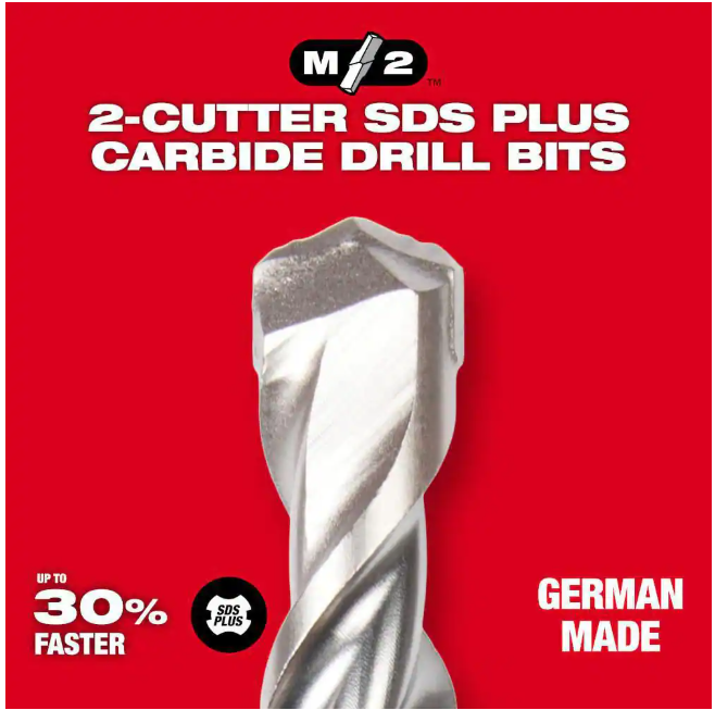 Pack of 2 - Milwaukee M/2 2-Cutter SDS-Plus Rotary Hammer Drill bits provide up to 30% faster drilling speeds and up to 20% more holes per charge in cordless rotary hammers. Breaker Point pulverize the material more effectively resulting in up 30% faster drilling speeds compared to competitive SDS-Plus drill bits. The variable flute allows for maximum debris extraction leading to up 20% more holes per charge in cordless rotary hammer while making it a very durable bit in corded and cordless rotary hammers. The enhanced rebar guards provide increased durability in hard aggregate and rebar. Additionally, M/2 features a centering tip for exact spot drilling, wear mark indicator indicating when the bit no longer meets ANSI diameter requirements, and a reinforced flute for durability and minimized vibration. The increased life and efficiency of the M/2 2-Cutter drill bit line provides the ideal solution in brick, block, and concrete for cordless and corded rotary hammer users.