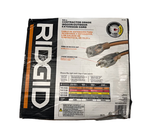 This Ridgid 50 ft. 10/3 Heavy Duty Extension Cord offers you maximum flexibility and durability. The SJTW outer jacket remains flexible from -58°F to 167°F, making this cord ideal for your jobsite or garage. This cord features a lighted female plug with a power indicator, which gives you a quick visual check to make sure that power is flowing through the cord.