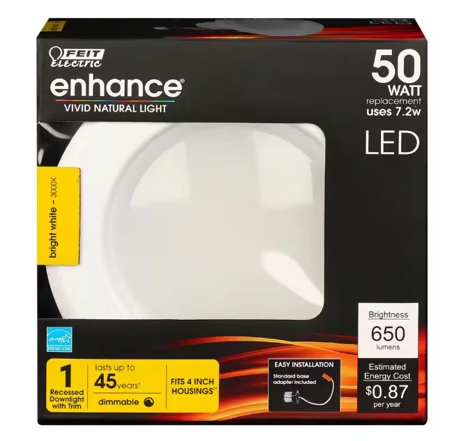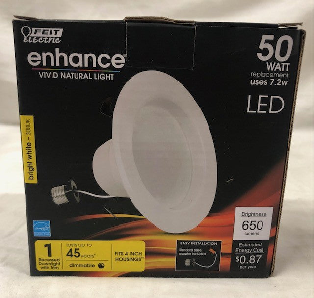 Convert your current recessed light trimming to energy saving LED with the Enhance LED Retrofit Recessed Light Trim Kit Downlight with the highest quality energy efficient light. Our 3000K Bright White high-powered LEDs with a 90 plus CRI (color rendering index) rating provide bolder color rendering and enhanced contrast so people and objects appear more realistic and vibrant. This kit will fit most 4 in. recessed cans, the light is dimmable and will replace a 50-Watt equivalent incandescent bulb. It produces a similar light output while using less energy than a standard incandescent light bulb. Get instant on to full brightness with relatively cool running performance. These Feit Electric Retrofit Kits have an average life of 50,000-hours/45.7-years and are RoHS and Energy Star Compliant. This kit is easy to install, comes with a standard base adapter and a pre-mounted trim for a hassle- free do-it-yourself installation. The Feit Electric energy saving LED 4 in. Enhance LED Downlight Retrofit Kit is ideal for residential use in kitchens, living rooms and dining rooms and for commercial use as general lighting in retail and hospitality spaces. Featuring a sleek, white design, this downlight is equipped for use in new construction, remodel and retrofit, replacing your current recessed bulbs.