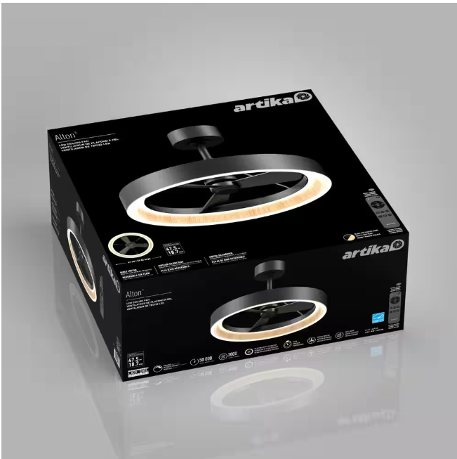 This unique LED ceiling fan alters the traditional fan archetype with its decidedly modern design. Encircled by 2 potent bands of light, it features a matte black and painted wood finish that harmonizes with the natural home decor of bedrooms and living rooms. Its high-quality, silent motor-with sealed and durable ball bearings-allows smooth, silent operation throughout the night. The fan offers 3 speeds, controlled effortlessly with a remote, which also adjusts light intensity (up to 2,000 Lumens), color temperature, a timer and airflow direction. It has a lifespan of 50,000-hours and is JA8-2022 Compliant.