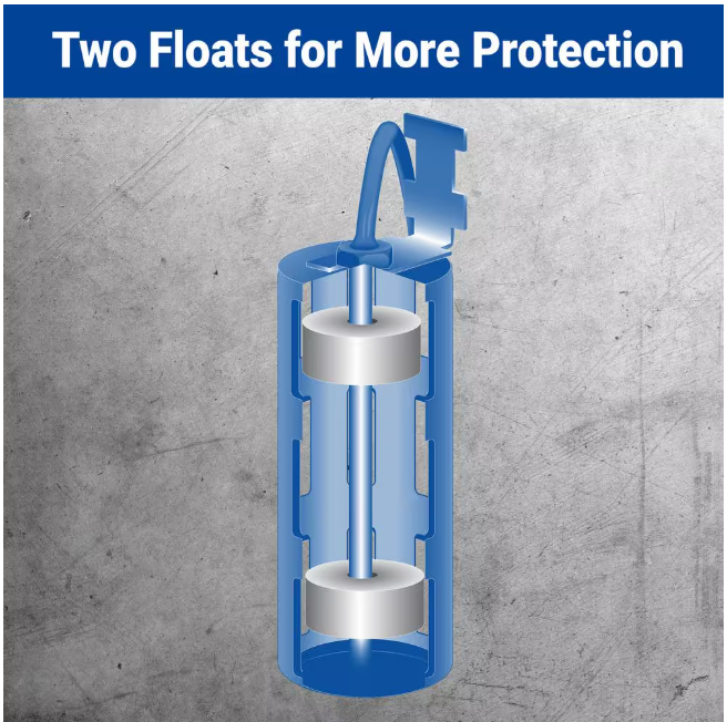 - Large floats detect 1/4 in. water level rises, automatically activating the sump pump