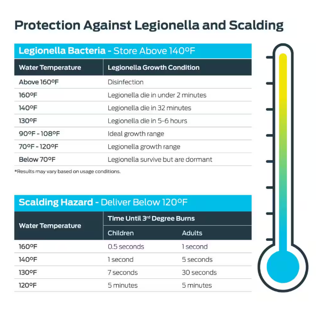 - Allows water to be stored at 140°F, preventing the growth of bacteria