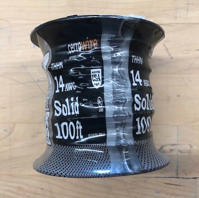The Cerrowire 100 ft. Black 14-Gauge Solid THHN Wire is a single-conductor copper electrical wire for indoor use. It features 15 allowable ampacities and is rated for 600-Volt. This wire comes in 100 ft. lengths on a shrink-wrapped spool.