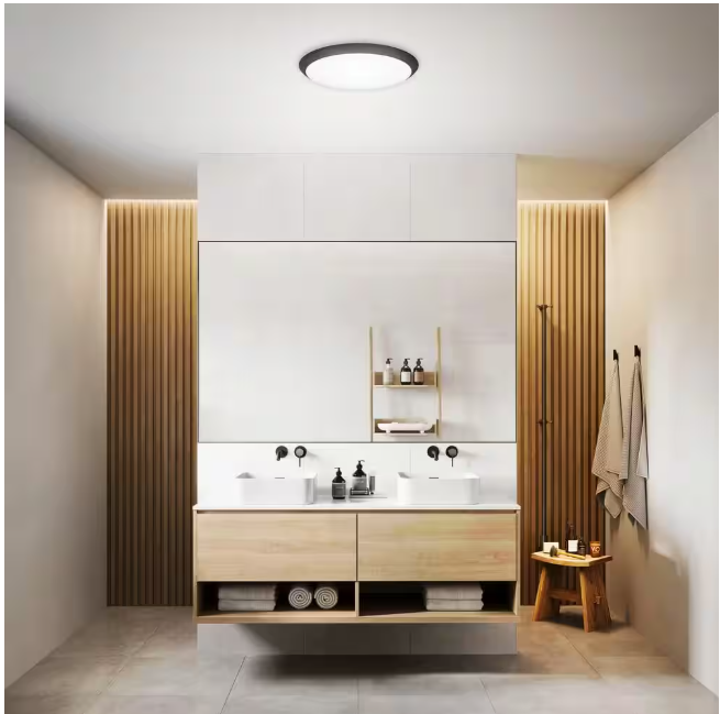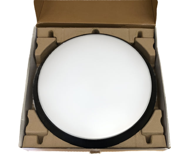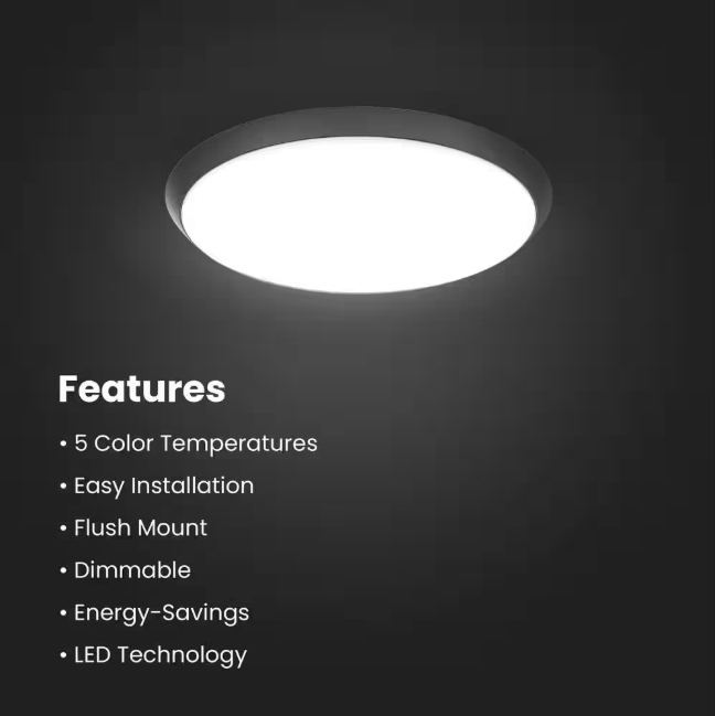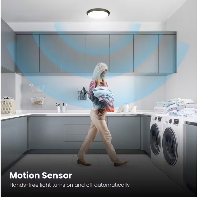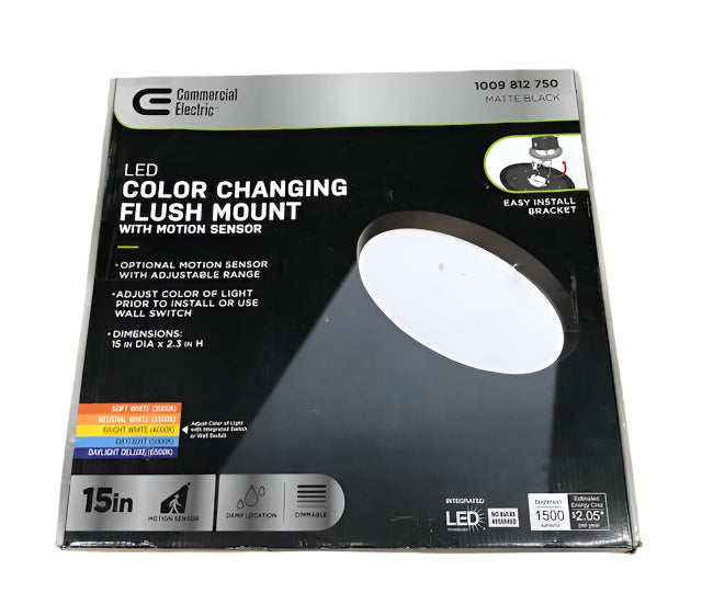 Get the right light for any situation or task with the Commercial Electric 15 in. Dimmable Selectable CCT Integrated LED Flush Mount Ceiling Light Matte Black. This 15 in. decorative ultra slim stylish ceiling flush mount light fixture creates a sleek silhouette, in a nickel tone trim and a frosted plastic lens, an ideal fixture for lower ceilings with no bulbs to replace. With our selectable color switch, you can preset your preferred light color temperature: soft white, neutral white, bright white, daylight or daylight deluxe (3000K/3500K/4000K/5000K/6500K) or set it to switch, for an easy toggle between color temperatures with a simple flip of a standard light switch. With multiple light color temperatures to choose from, along with full range dimming (with a compatible dimmer), your lighting can suit your mood. This LED ceiling light is equipped with a motion detector sensor for instant light activated by motion, a hands-free way to light up a space as you walk by. Once the source of motion is cleared, light will wait 5-minutes until turning off. The selectable switch can be preset up to a 15 ft. distance or off and the light can be used as a standard switch light. The streamlined design of these LED flat panels combined with patent pending easy-to install mounting brackets enables simple installation in both residential and commercial buildings. This easy to install light fixture has an average life of 50,000-hours/45.7-years.