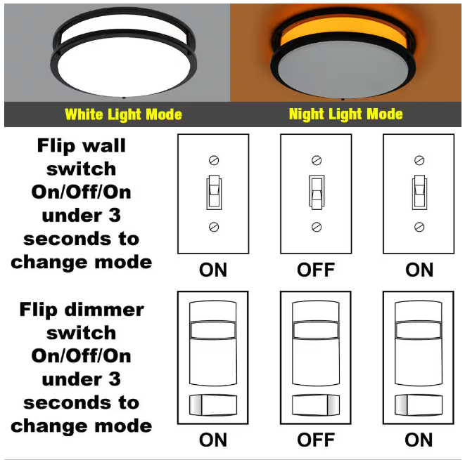 - To activate Night Light mode, quickly toggle your wall switch ON/OFF/ON - To return to downlight mode, quickly toggle wall switch OFF/ON