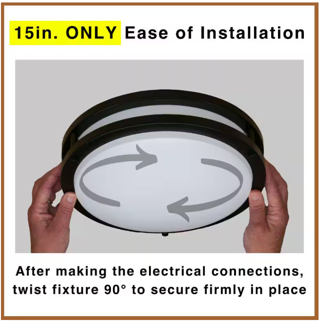 Commercial Electric 15in. Round Matte Black Orbit LED Flush Mount Ceiling Light with Night Light feature adds a Modern decorative flair to your home or office. This fixture mounts quickly into an existing junction box using the included TwistFit mounting bracket. The TwistFit bracket installs in less than 2-minutes and ensures a tight seal that won't allow bugs or dust to enter. Additionally, it does not need the lens removed to install, simply twist the fixture into place. Perfect for DIY-ers. Made of durable stamped steel and frosted acrylic lens, this fixture produces crystal-clear illumination with no yellowing, discoloration or dark spots over time. Prior to installation, adjust color temperature between Soft White, Bright White or Daylight and it is dimmable. Accessible with a simple flick of the switch, use the Night Light feature delivering a soft Amber hue around the fixture creating a cozy warm ambience. Our LED Orbit flush mount provides long-lasting service and is maintenance free with no bulbs to replace. Ideal for kitchen, laundry room, bathroom, bedroom, basement, office, corridors/hallways and retail spaces and so much more.