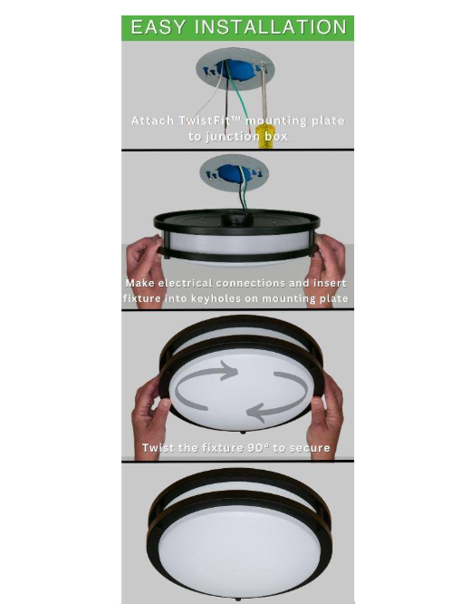 - Ease of installation with TwistFit mounting bracket to junction box - Simply attach mounting plate to junction box, make electrical connections and twist fixture 90° to secure firmly in place
