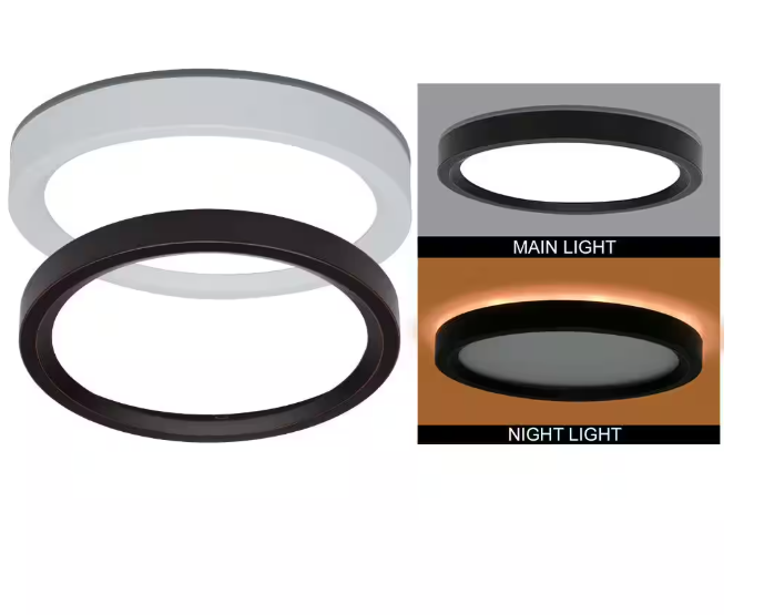 Add a Modern touch to your lighting design with Commercial Electric 7.5in. Round LED Flush Mount ceiling light with optional White and Oil Rubbed Bronze trims. Before installation, you can easily select your preferred color temperature using the convenient slide switch on the back of the fixture. Additionally, the Night Light feature creates a soft Amber glow around the fixture, offering a warm and inviting ambient accent light. With no bulbs to replace and a lifespan of up to 50,000 hours, this maintenance-free flush mount is perfect for a variety of spaces, including kitchens, pantries, bedrooms, bathrooms, closets, stairways, hallways, basements, laundry rooms, craft rooms, playrooms, and offices.