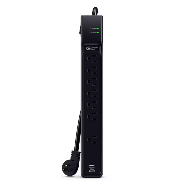 The Commercial Electric 8 ft. 7-Outlet Surge Protector with USB in Black turns 2 wall outlets into 7. Outlets get crowded when phone chargers and electronics have to share the standard receptacles found in most homes. Expands a standard 2 plug grounded wall outlet to 7 surge-protected, grounded plugs. Features 2 USB USB-A 2.4 Amp, USB-C 15-Watt non-PD, total 18-Watt so you can charge phones and other devices without sacrificing the primary outlets. A wide spaced outlet allows room for an AC power block. Protect your home with 2100 joules. Perfect for protecting personal computers, wireless/VoIP routers, cable/DSL modems, tablet chargers and other rechargeable personal electronics.