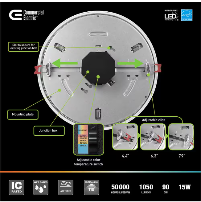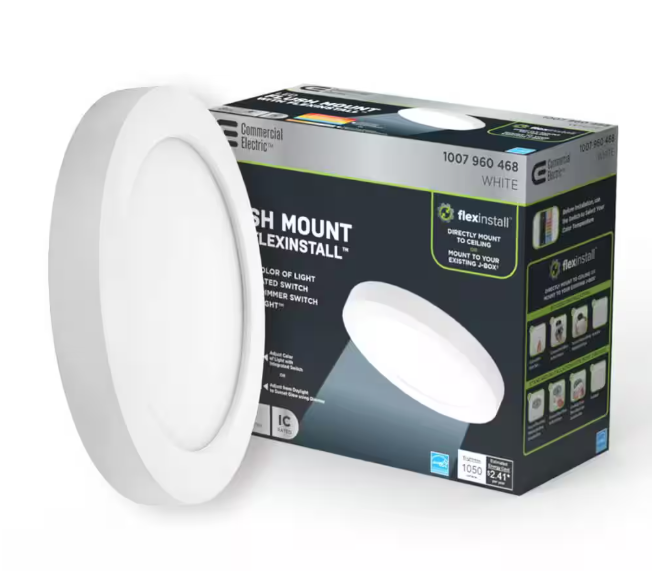 Introducing Flexinstall Ceiling Lights, these versatile fixtures offer customizable lighting solutions and two easy mounting options. The first mounting option is for new locations, and it is as simple as cutting a hole and quickly installing with the included integrated junction box and adjustable clips to fit multiple hole sizes. The second mounting option allows for wiring directly into existing junction boxes. By removing the integrated junction box and clips, the mounting plate is ready to be installed into the existing junction box in the ceiling. Choose from 5 color temperatures, ranging from 2700K to 5000K, for ideal illumination at any time of day or utilize the patented DuoBright feature. DuoBright feature uses standard dimmer to adjust lights, changing the color temperature for ultimate customization. With impressive specs,including 15W power, 1050 Lumens, and a 110° beam angle, it is ENERGY STAR Certified and suitable for wet areas. Trust its durability with a wet rating, making it perfect for showers, bathrooms, and more. Add Flexinstall Ceiling Lights for style, versatility, and convenience.