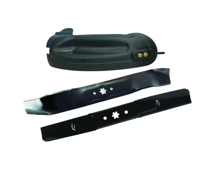 - Contents include two mulching blades with a 6-point star center hole pattern, one molded plug and mounting hardware.