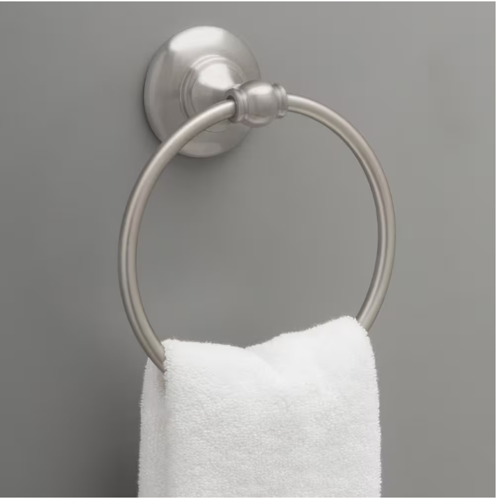 - BATH HARDWARE: Brushed nickel round closed towel ring for the bathroom