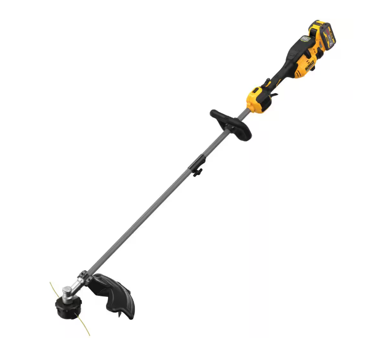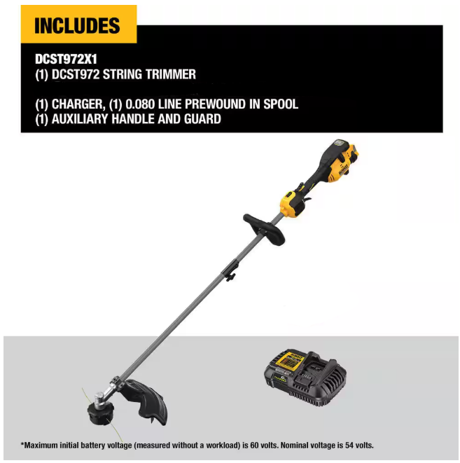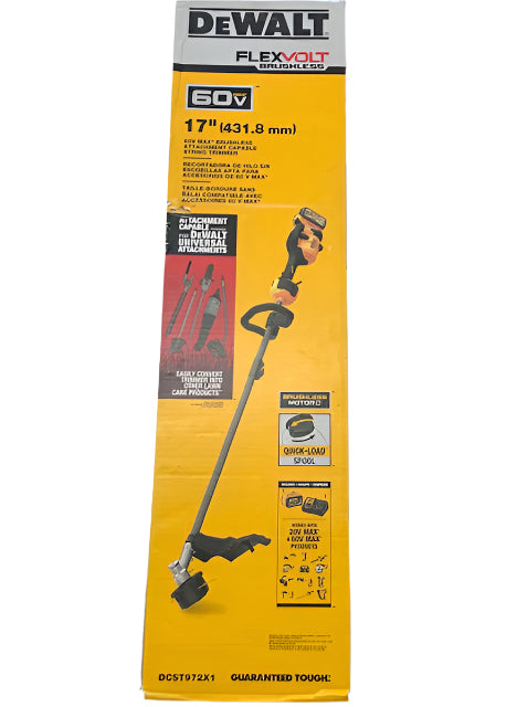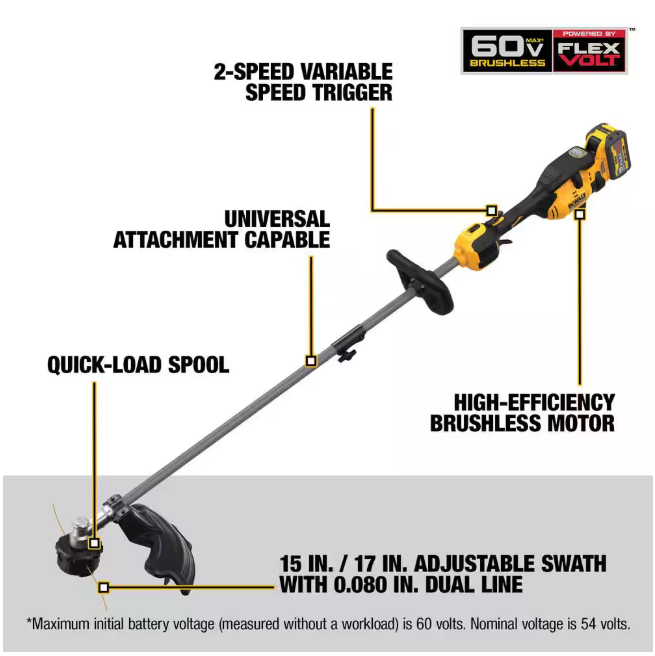 Does not include battery. The DEWALT 60-Volt Attachment Capable String Trimmer delivers versatility and power to get your job done. It features and high-efficiency brushless motor that maximizes runtime and motor life, while providing the power to tackle tough overgrowth and withstand heavy-duty use. This string trimmer is also universal attachment capable, it will transform to other outdoor tools with attachments from DEWALT as well as other universal brands. Requires a 60-Volt MAX FLEXVOLT battery that powers 60-Volt MAX DEWALT tools and is also backwards compatible to work with 20-Volt MAX DEWALT tools.