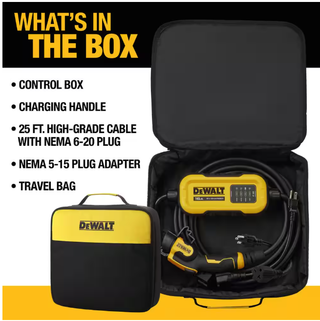Power on-the-go. introducing the DEWALT level 1/ level 2 portable electric vehicle charger, delivering between 12 to 16 Amps up to 3.84 kW of knockout power, charge up to 12 miles per hour, compatible with all SAE J1772 electric vehicles, confidently charge into the future at home or on the road with DEWALT by your side, this charger includes a NEMA 6-20 plug and interchangeable NEMA 5-15 adapter, experience the convenience and freedom of our portable EV charger with the widely compatible NEMA 5-15 adapter, with the ability to charge anywhere there is a common household outlet, the world is your playground, when not in use, store your portable charger in the included travel bag for safe keeping, built tough, this EV charger comes with the durability and safety you'd expect from DEWALT, premium materials and a smart design are brought to life with the heavy-duty protective cage, 25 ft. high-grade UL certified cable and anti-slip grip charging handle. CSA certified, this EV charger is rated for indoor and outdoor use with IP66 waterproof rating and contains over 10 technologically advanced safety features including overvoltage, overcurrent, overheat, overcharge and surge protection, the DEWALT portable EV charger is ready to use right out of the box with no installation required, travel bag and NEMA 5-15 adapter included for convenient charging on the road, guaranteed tough, we stand by our product with a 3-year limited warranty and 24/7 technical customer support