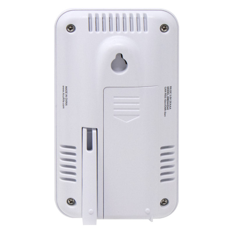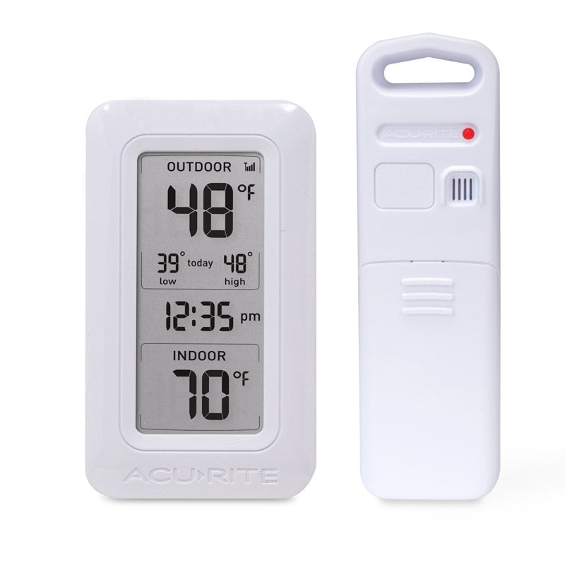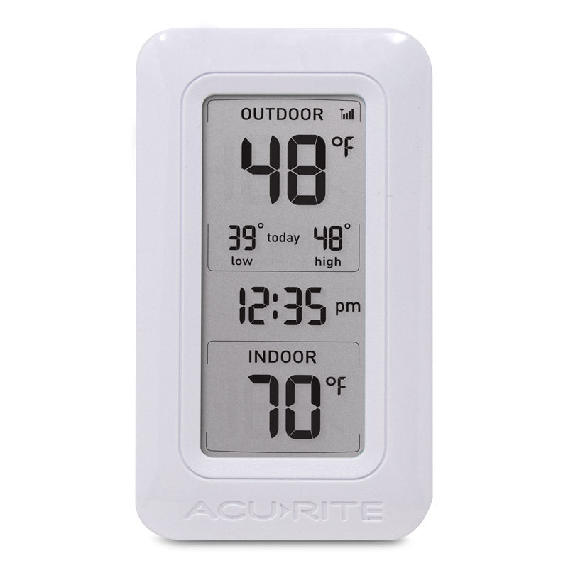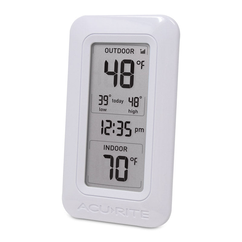 Indoor and outdoor temperature (Fahrenheit or Celsius) with trend arrowHigh and low temperature records by day, over 48 hours, and for all-timeClock (12-hour)Tabletop or wall-mountable design.