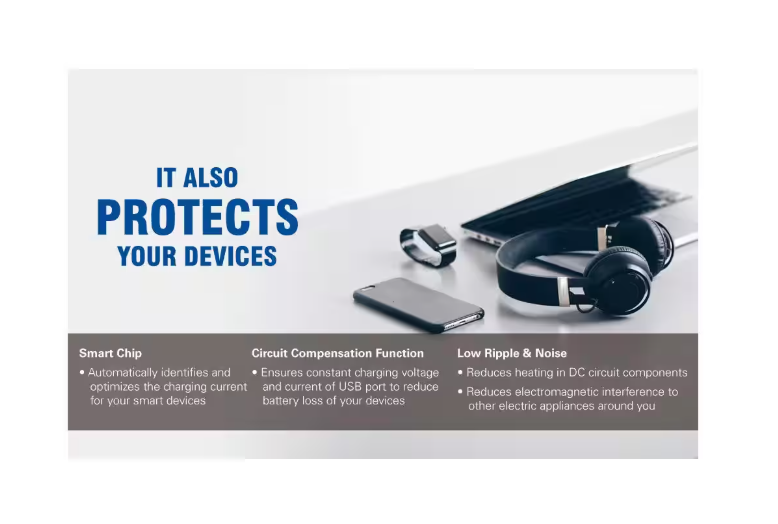 - Circuit compensation function - ensures constant charging voltage and current of USB port to reduce battery loss of your devices