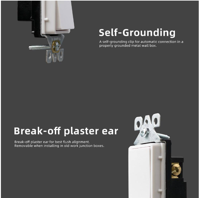 - Easy installation - break-off plaster ear for best flush alignment and narrow slim body design leaves more room for wires in the standard junction box