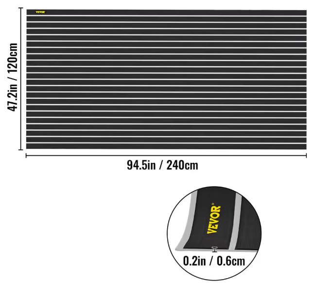 - Premium EVA foam: color: black plus white lines, product size: 94.5 in. L x 47.2 in. W, thickness: 0.2 in., hardness: 60 this boat decking mat adopts durable EVA foam as material, sound and shock absorption, heat insulation, saltwater-proof, stain-proof, soft and not easy deformation and tear, the reliable material ensures a long service time