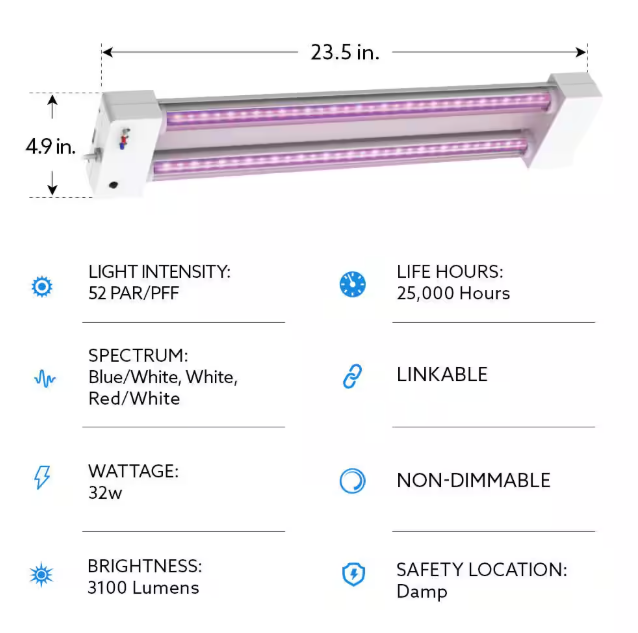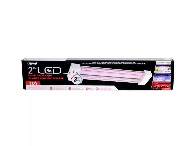 Feit Electric's 2 ft. LED Adjustable Spectrum Grow Light only uses 32-Watt and comes fully assembled with an ultra-light weight design that can be used in hanging or flush mount installation. Save time, space and money with Feit Electrics LED growing eco system. This no-humming LED emits adjustable and precise wavelengths for superior photosynthetic response. Switch color spectrums to match the plants growth stage and increase overall yield, from blue or white spectrum for leaf and vegetative growth to red spectrum for flowering and budding or Red/White/Blue combination for a good general setting for all plants. There are no lamps to dispose of or replace and its cool operation prevents burning of leaves compared to high pressure sodium lamps. Includes wire harnesses and screws for easy hang or flush mount installations. Durable smooth edge housing and light weight design facilitates the installation process. Up to 5 of these fixtures can be linked together with its 5 ft. cord enabling easy and flexible runs. Our long lasting 25,000 hours grow lights will cut down the costs and time spent of replacing incandescent and fluorescent lamps while also providing energy saving LED light.