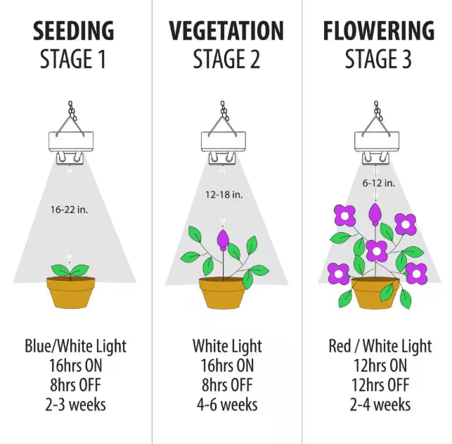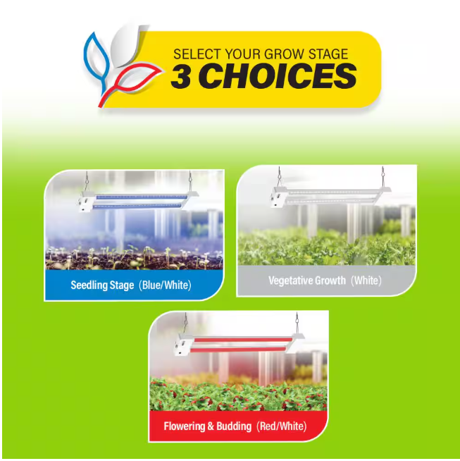 - Selectable switches to allow the use of different color light spectrums for the different stages of plant growth