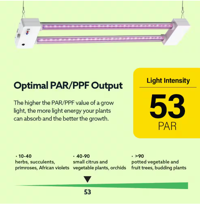 - Photo synthetically active radiation (PAR/PPF value): 49 mol/s