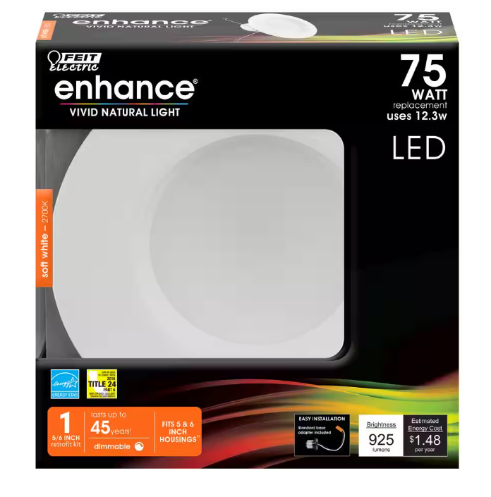 Convert your current recessed light trimming to energy saving LED with the Enhance LED Retrofit Recessed Light Trim Kit Downlight with the highest quality energy efficient light. Our high-powered LEDs with a 90+ CRI (color rendering index) rating provide bolder color rendering and enhanced contrast so people and objects appear more realistic and vibrant. This kit will fit most 5 in. or 6 in. recessed cans, includes a soft white 2700K LED and an adjustable head so the light can be customized for any room. The light is dimmable and will replace a 75W equivalent incandescent bulb. It produces a similar light output (925-Lumen), uses 10.2-Watt of electricity and up to 83% less energy than a standard incandescent light bulb. Get instant on to full brightness with relatively cool running performance. These Feit Electric Retrofit Kits have an average life of 50,000-hour/45.7-year and are RoHS and ENERGY STAR compliant. This kit is easy to install, comes with a standard base adapter and a pre-mounted trim for a hassle- free do-it-yourself installation. The Feit Electric energy saving LED 5/6 in. Enhance LED Downlight Retrofit Kit is ideal for residential use in kitchens, living rooms and dining rooms and for commercial use as general lighting in retail and hospitality spaces. Featuring a sleek, white design, this downlight is equipped for use in new construction, remodel and retrofit, replacing your current recessed bulbs.