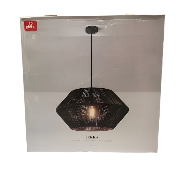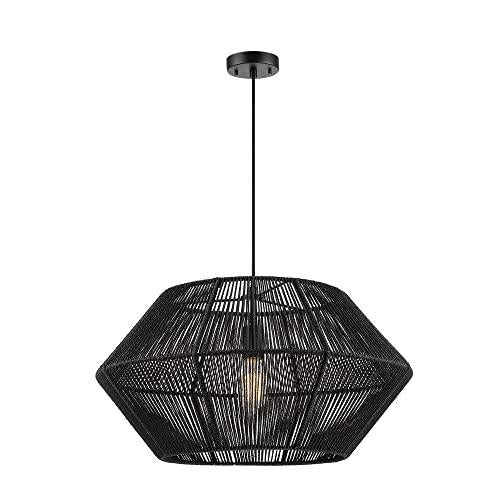 Globe Electric Terra 1-Light Matte Black Chandelier with Natural Twine Shade and Designer Black Cloth Hanging Cord