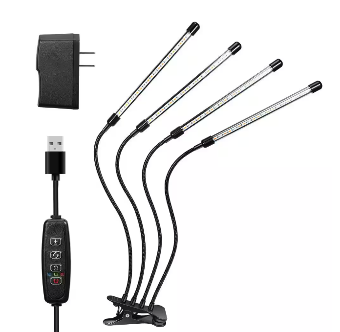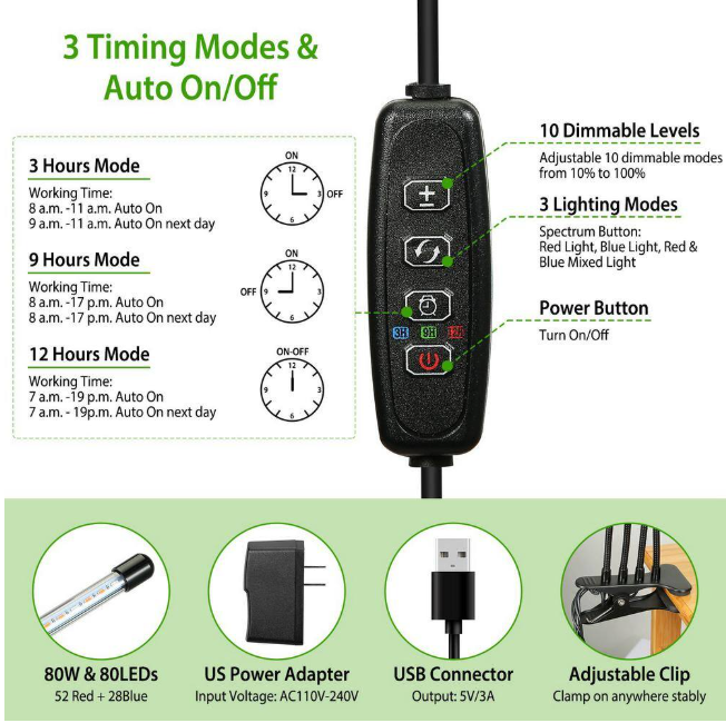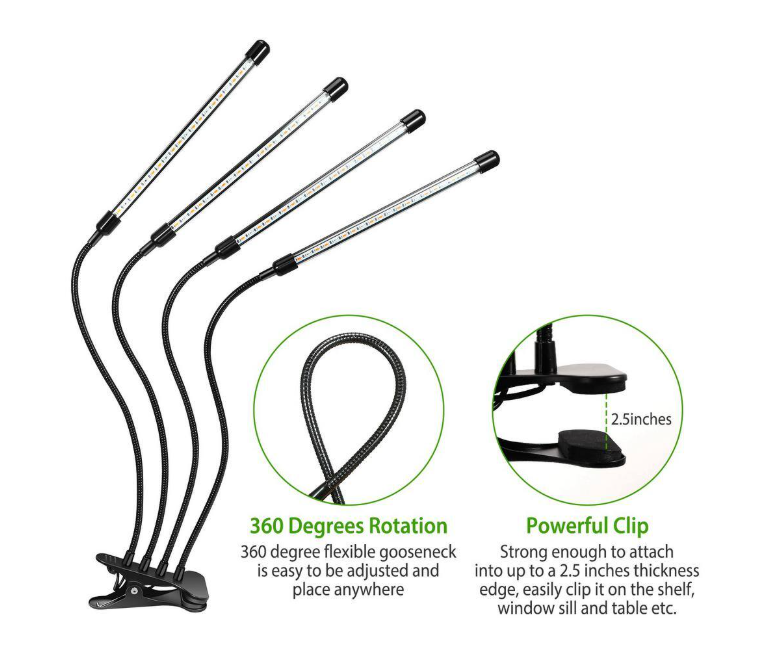 Upgraded 4 Head Plant Grow Lights: This upgraded grow light with 4 goosenecks and 80 bulbs solves the trouble of setup and inflexibility of traditional hanging grow lights and provides a much wider coverage area than clip grow lights with only two or three arms. The coverage area with one head is roughly 24-27 inches depending on the height the head is aimed. 3 Lighting Modes With 10 Dimmable Levels: Based on the type and output of light (PAR) needed to support photosynthesis, this LED Grow Light with 3 lighting modes(Red Light, Blue Light, Red and Blue Mixed Light) and 10 dimmable modes from 10% to 100%, which effectively supplements the lack of natural sunlight and promotes the growth of plants at all stages. Comes equipped with the circular-memory time function allowing you to select 3 lighting times (3H/9H/12H) for your system and it will automatically turn on/off every day according to your settings which requires no manual operation and takes good care of your plants when you are at work or on vacation. Powered by USB or AC Power Plug (USB power adapter included) it's portable and convenient to use at home or at the office. The goose necks can be rotated 360 degrees. Powerful Clip: The clip is strong enough to attach to up to 2.5 inch thick edges so you can easily clip it on the shelf, window sill and/or table etc. It's made of high quality materials and springs.