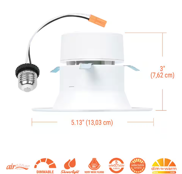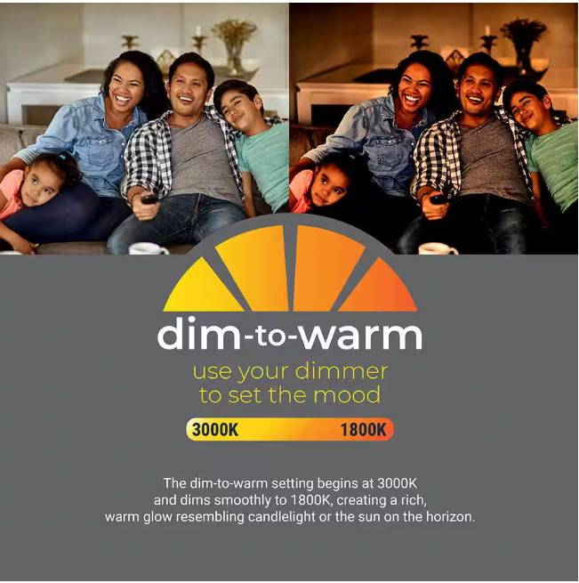 - DIMMABLE + DIM-TO-WARM: Add any compatible dimmer for flicker-free dimming to 5%; Select the Dim-to-Warm setting and your lighting will transition from bright white (3000K) to a warm, candlelight (1800K) as it dims