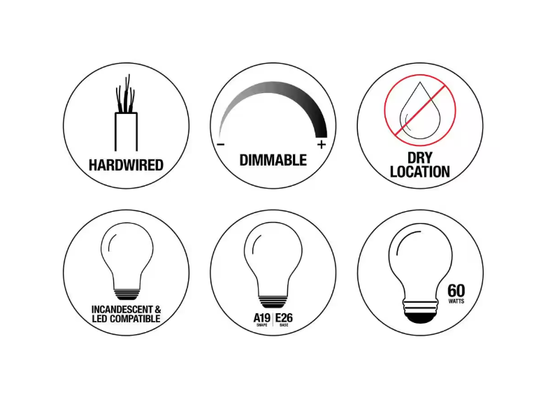 - Assembly and install parts include: hex nut, nipple, shade, bottom cover, finial, wire connectors, outlet box screws, mounting screws, mounting strap and ground screw