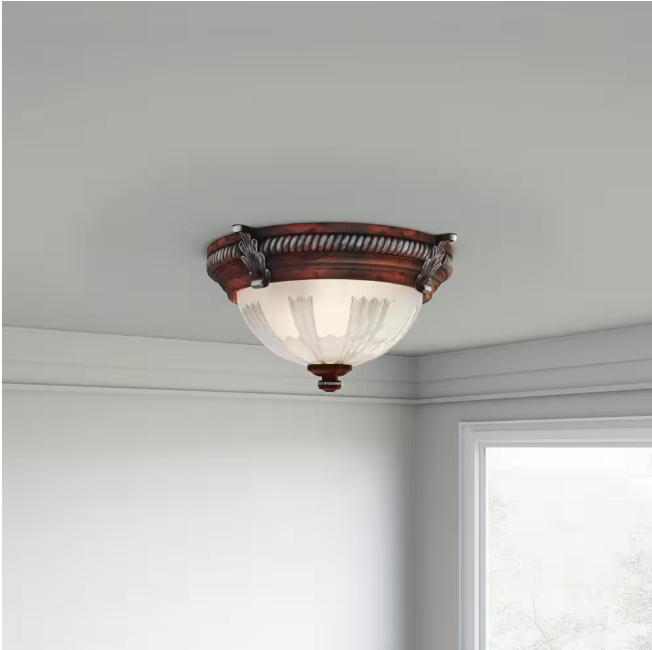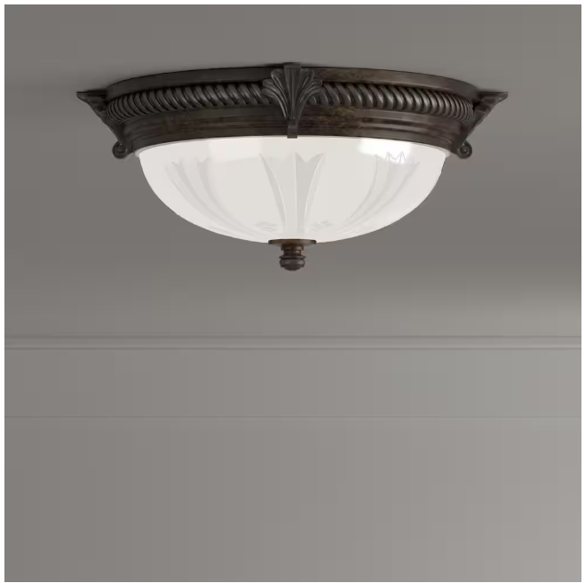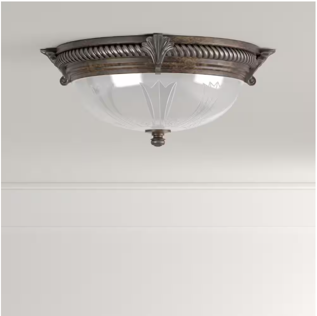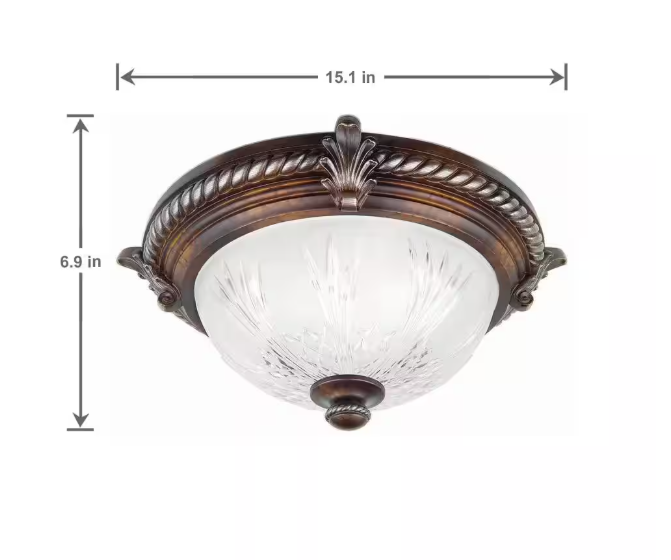 Hampton Bay Bercello Estates 15 in. Traditional 2-Light Volterra Bronze Dimmable Flush Mount Ceiling Light with Etched Glass Shade