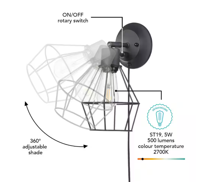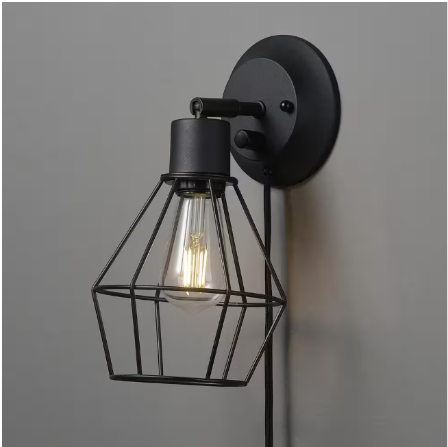 With its plug-in or hardwire collection, Hampton Bay created a wall sconce for all your lighting needs. This caged shade wall light offers dark academia design that complements all interior decor. This adjustable wall fixture can be pointed up or down, allowing you to customize your lighting ambiance and mood. Ideal for use in kitchens, restaurants, bars, and dining rooms - the exposed bulb delivers a cozy, vintage look.