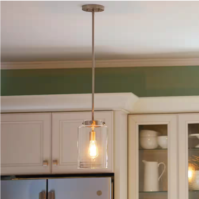 Enrich your interior design with the classic lighting of this Hampton Bay one-light mini pendant. An ideal choice over kitchen islands or in dining areas, this pendant light offers contemporary style that will suit any home decor. Its clear glass shade casts a beautiful glow. Steel construction offers longevity of this mini pendant light. It accepts one 40-Watt, medium-base bulb, which is not included. This ceiling light offers a maximum hanging height of 61 in.