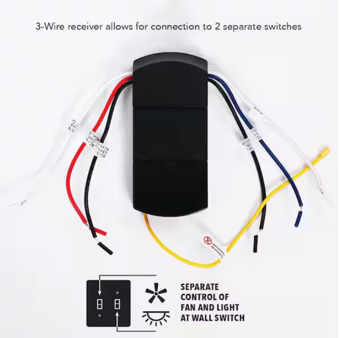 - Updated 3-wire design allows the receiver to be connected to two separate switches for independent fan and light control.