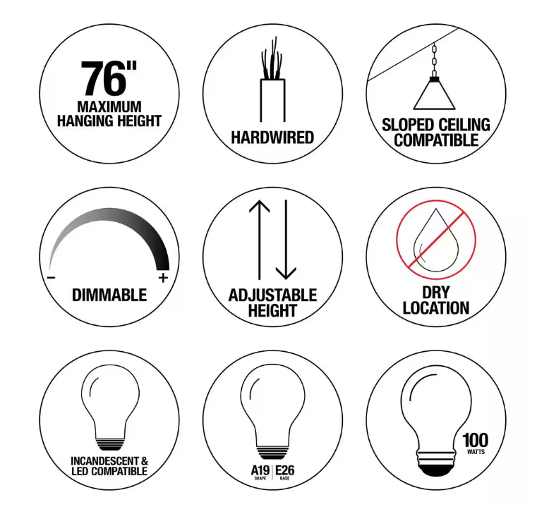 Adjustable Hanging Length, Assembly Required, Dimmable, Indoor, Sloped Ceiling Adaptable |