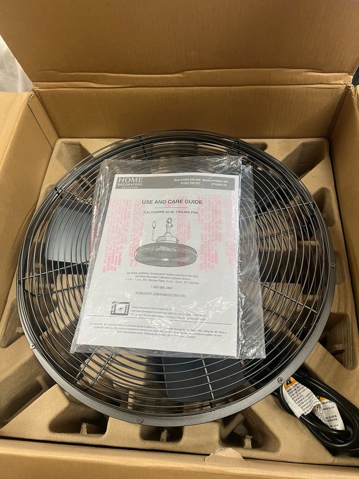 Make a small area feel cooler with this Home Decorators Collection Calthorpe 20-in. portable ceiling fan. Made for 10 ft. x 10 ft. areas, it offers a hook-style installation. Perfect for gazebos, greenhouses and tents, this wet-rated outdoor ceiling fan includes a 9.5-ft. power cord. The three natural iron blades add style.