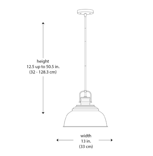 The Shelston Collection from Home Decorators exhibits industrial indoor lighting with farmhouse appeal, ideal for a variety of home styles from traditional to contemporary. Enhance your entryway, kitchen, or dining room with the updated styling of this Shelston 13 inch round pendant. Highlighted by a simple metal dome shade and vintage-inspired antique gold finish, this fixture will add a unique design and functional illumination to your home. The shiny metallic shade contrasts with the black extension rods and hardware, a color combination that is both chic and eye-catching. The smaller size works well when hung as a single unit in smaller spaces, or when installed as a set along a linear kitchen island or bar table. Shop the Shelston Collection for additional finish options, sizes, and coordinating indoor ceiling lighting.