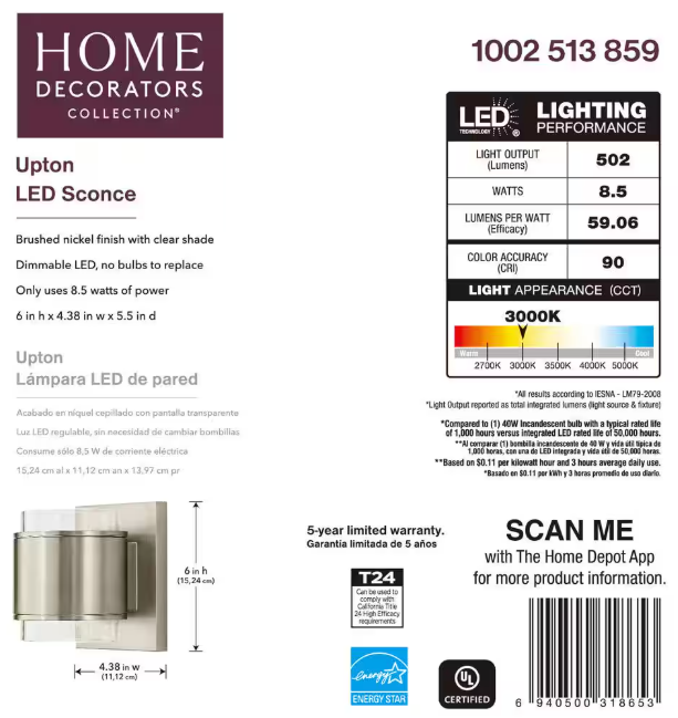 Home Decorators Collection Upton Brushed Nickel LED Sconce