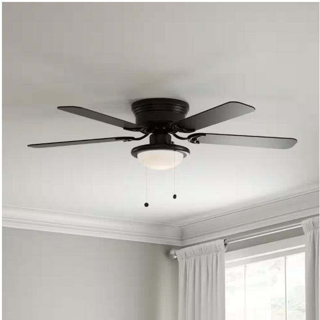 The Hugger 52 in. LED black ceiling fan, perfect for flush-mount installations where ceiling height is a consideration. This fan boasts reversible blades, enhancing its modern black finish with either black or mahogany blade options for a stunning visual appeal. The opal frosted dome light fixture is equipped with a 9-watt LED bulb, delivering bright and efficient illumination. With a 3 speed reversible high-performance motor that ensures powerful yet quiet operation, and a 52 in. blade span, this fan is an excellent choice for most interior rooms up to 14 ft. x 14 ft.