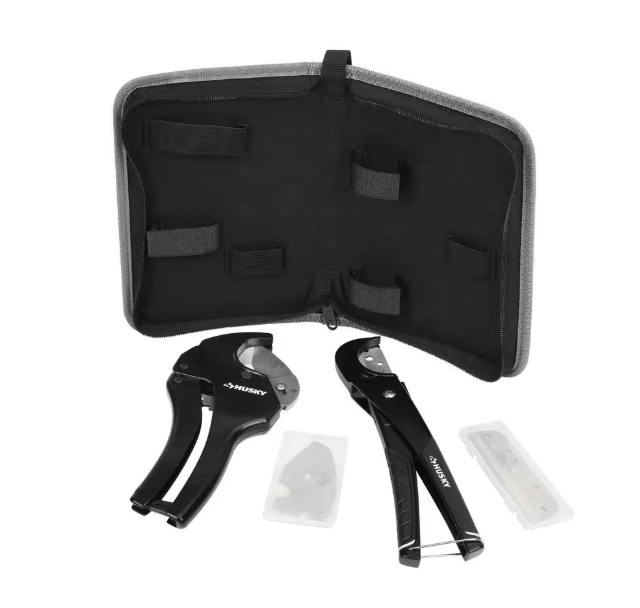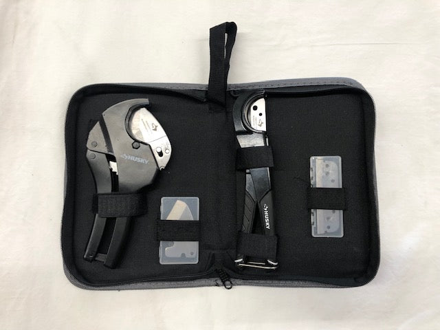 The PVC cutting kit includes Husky's 1-1/4 in. quick-change ratcheting cutter with replacement blade, Husky flexible tube cutter with replacement blade. It also comes with foldable pouch for storage and transportation. All included tools are covered by the Husky lifetime warranty.