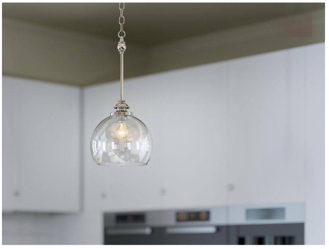 With its light and airy silhouette, the simplified, updated traditional look of the Lecelles 1-light pendant offers an elegant, sophisticated presence while its Polished Nickel finish complements its form. Inspired by silver candlesticks seen in a Lake Como antique shop, Lecelles is both aspirational and luxurious. With elongated stems, repetition of ornate details and unique, wine-goblet-shaped clear glass, you'll enjoy a fixture that outwardly celebrates purity of form and attention to detail.