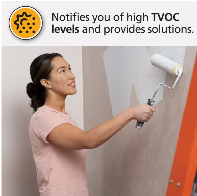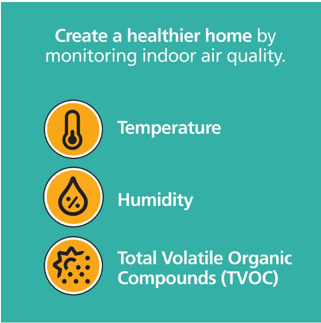 - Monitors for changes in temperature & harmful chemicals in the air that can impact your health - temperature, relative humidity, & Total Volatile Organic Compounds (TVOCs)