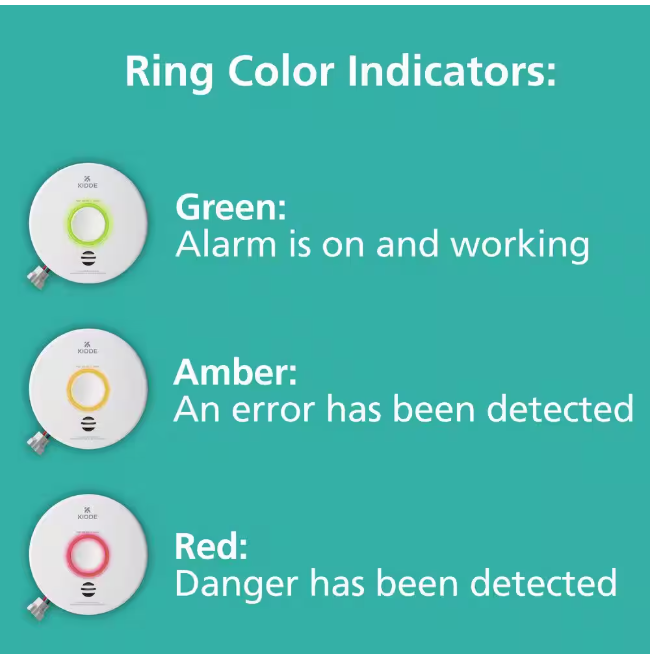 - LED Indicator Lights provide the status of the unit: green = alarm is on and working, amber = an error has been detected, and red = a danger has been detected