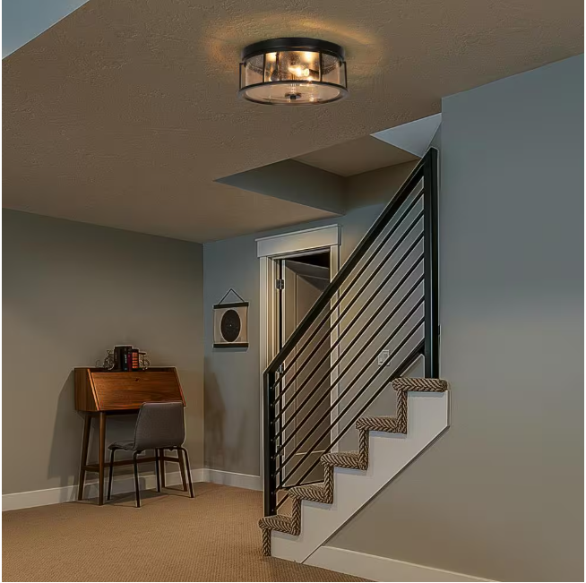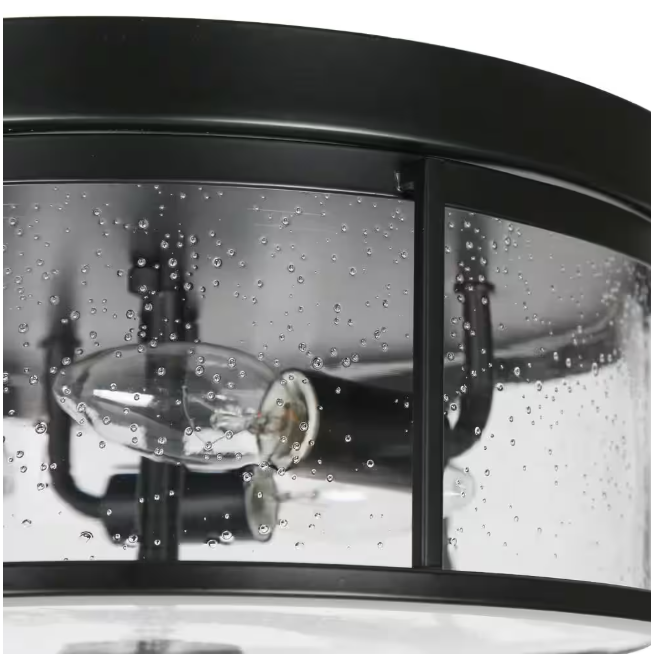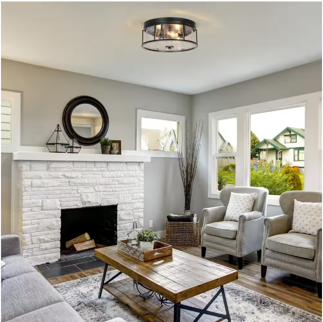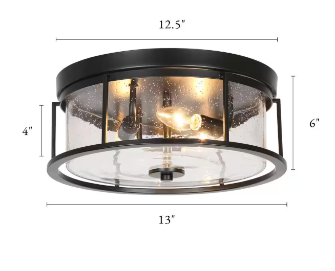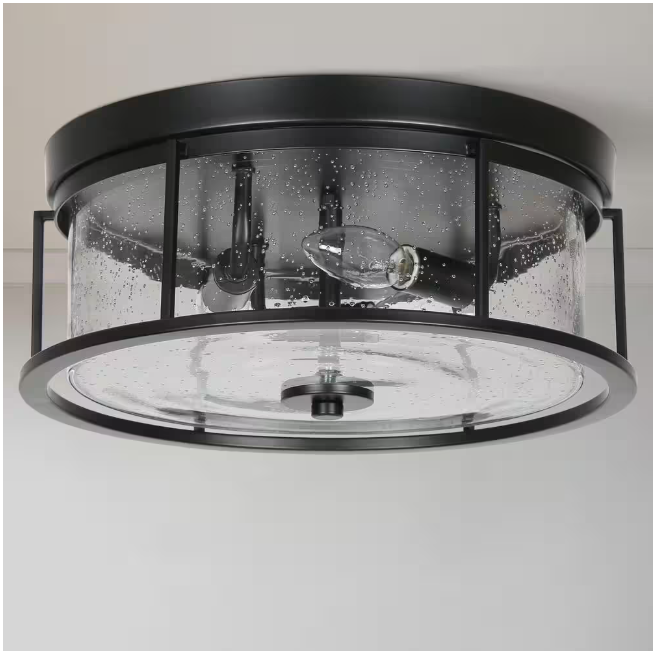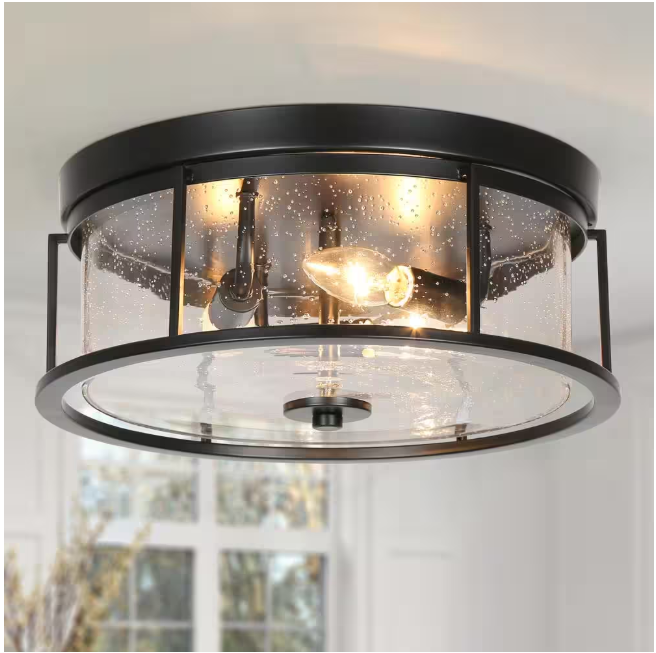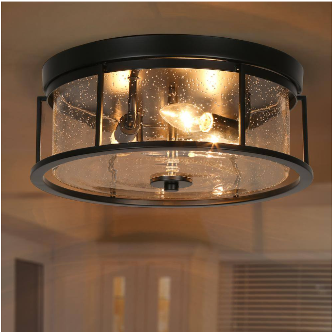 This LNC 13 in. 3-Light Modern Black Industrial Metal Cage Flush Mount provides an elegant farmhouse style for your space. Featuring a skillful design, this round ceiling light is composed of a black metal frame inlaid with a clear drum glass shade. The seeded glass can form a dreamy light effect, which instantly adds mood when lighting up. Designed to offer ideal illumination and glamorous addition to your bedroom, living room, entryway, kitchen, dining room, foyer, etc.