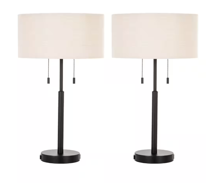 Our set of modern table lamps is a beautiful and helpful addition to any home, office, or dorm room thanks to its classic design and convenient charging station. Standing 24 in. tall, these aesthetic lights will brighten your space and your life whether needed for office desks, hallway side tables, bedroom night stands, or living room end tables. Softened by their natural linen lamp shades, our desk lamps have a retro modern look that imparts a timeless elegance to home decors from rustic farmhouse to industrial minimalist. The two E26 sockets on each of these twin lamps accommodate any incandescent, CFL, or LED light bulbs up to 60W; each bulb is separately controlled by its own pull chain to allow more lighting options. Each desk lamp also comes with a built-in USB port and 2-prong AC outlet to let you easily charge your personal electronic devices. Enjoy this pair of helpful lamps around your own home or use them as a friendship lamp set for housewarming, birthday, and Christmas presents for friends and family.