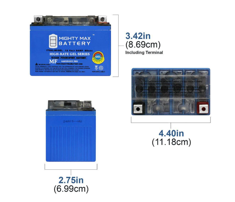 The YTX4L-BS GEL is a 12-Volt 3 Ah GEL (Maintenance Free) battery. Requires no addition of water during the life of the battery. The MIGHTY MAX YTX4L-BS GEL is a TRUE DEEP CYCLE battery that can be mounted in any position, requires no maintenance. When a GEL Cell battery is charged, no hazardous fumes escape the battery case, gases are processed within the battery itself. No acid mist and pollution to the environment when charging and discharging. This Battery is Low self-discharging and durable for storage and has a nice ability for resilience after over-discharge and the capacity of high discharge current increases by 30% over VRLA. Common uses for the YTX4L-BS GEL: ATVs, Motorcycles, Personal Watercraft, Jet Ski's, Snowmobiles and more.