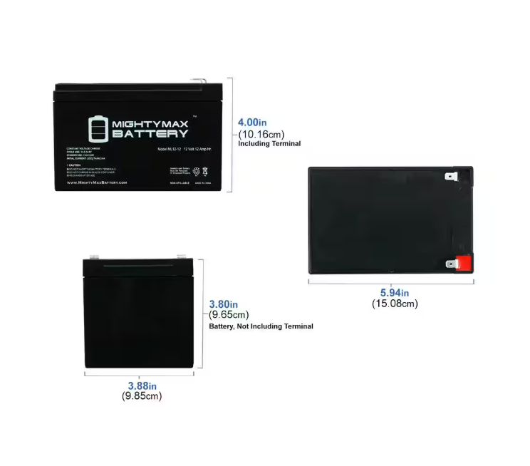 Delivering power when you need it, the MIGHTY MAX ML12-12 12-Volt 12 Ah uses a state of the art, heavy-duty, calcium-alloy grid that provides exceptional performance and service life in both float and cyclic applications. The ML12-12 is an Absorbent Glass Mat (AGM) technology with a valve regulated design, that can be used in enclosed and indoor environments without leaking or maintenance, providing a superior performance for thousands of models. MIGHTY MAX SLA batteries are utilized in a wide variety of applications including, Consumer Electronics, Electric Vehicles, Engine Starters, Golf Carts, Hunting, Lawn and Garden Tools, Medical Mobility, Motorcycles, Power sports, Portable Tools, Solar, Toys and Hobby, Access Control Devices, Emergency Lighting, Security and more.