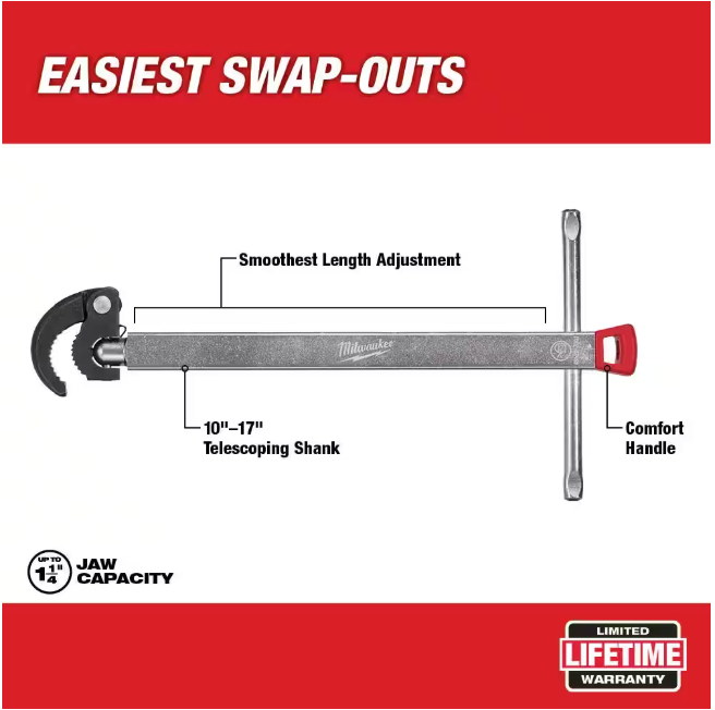 The Milwaukee 1.25 in. Basin Wrench is designed for the industry's easiest basin swap-out's in under sink applications and extremely tight spaces. The Milwaukee Basin Wrench features an ergonomic handle, designed to fit in the palm for maximum efficiency and comfort. A new-to-world ratchet ready and screwdriver ready handle allows for maximum speed and break-away torque for difficult to remove or corroded fasteners. Featuring a forged and hardened jaw with an optimized tooth pattern, the Milwaukee Basin Wrench provides maximum grip and durability. The telescoping handle is designed to allow for easy adjustment between handle lengths.