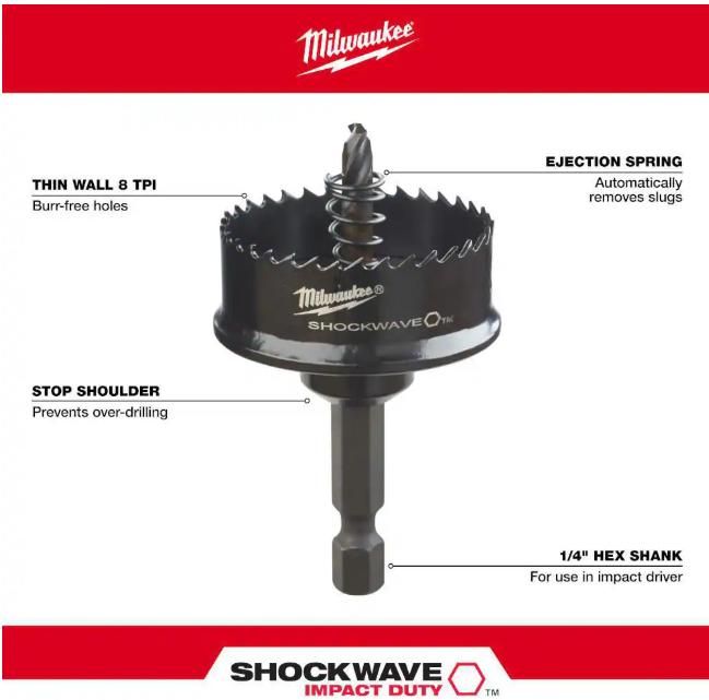 Designed with a robust 1/4 in. quick change hex shank, Milwaukee Shockwave Impact Duty Thin Wall Hole Saws give professionals a hole making solution to use with impact drivers. Utilizing a thin wall, 8 TPI design, Thin Wall Hole Saws deliver a burr-free cut up to 40% faster than standard bi-metal hole saws. The included ejection spring removes the frustration of manually removing slugs by automatically ejecting the material. A stop shoulder design prevents over-drilling into material and potentially damaging inner components of electrical and junction boxes. Chose Thin Wall Hole Saws for use in plastics and thin gauge metals up to 1/8 in. thick.