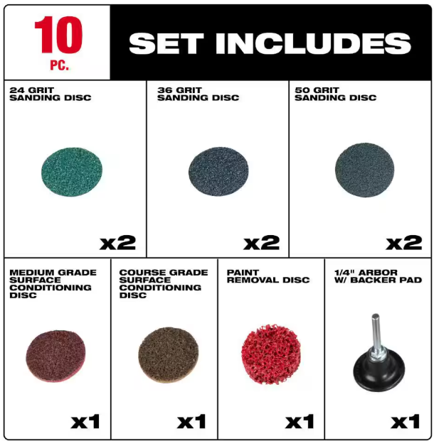 - Kit includes: (2) 24 Grit Sanding Discs, (2) 36 Grit Sanding Discs, (2) 50 Grit Sanding Discs, (1) Medium Grade Surface Conditioning Disc, (1) Course Grade Surface Conditioning Disc, (1) Paint Removal Disc, (1) Universal ¼" Arbor w/ Quick Change Backer Pad